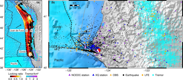 图1.Cascadia俯冲带(由南部的Gorda板块和北部的Juan de Fuca板块组成)的构造背景图以及本研究所用的地震事件和地震台站分布的平面图。左图中红-黄-白背景图表示板块界面的震间闭锁模型。