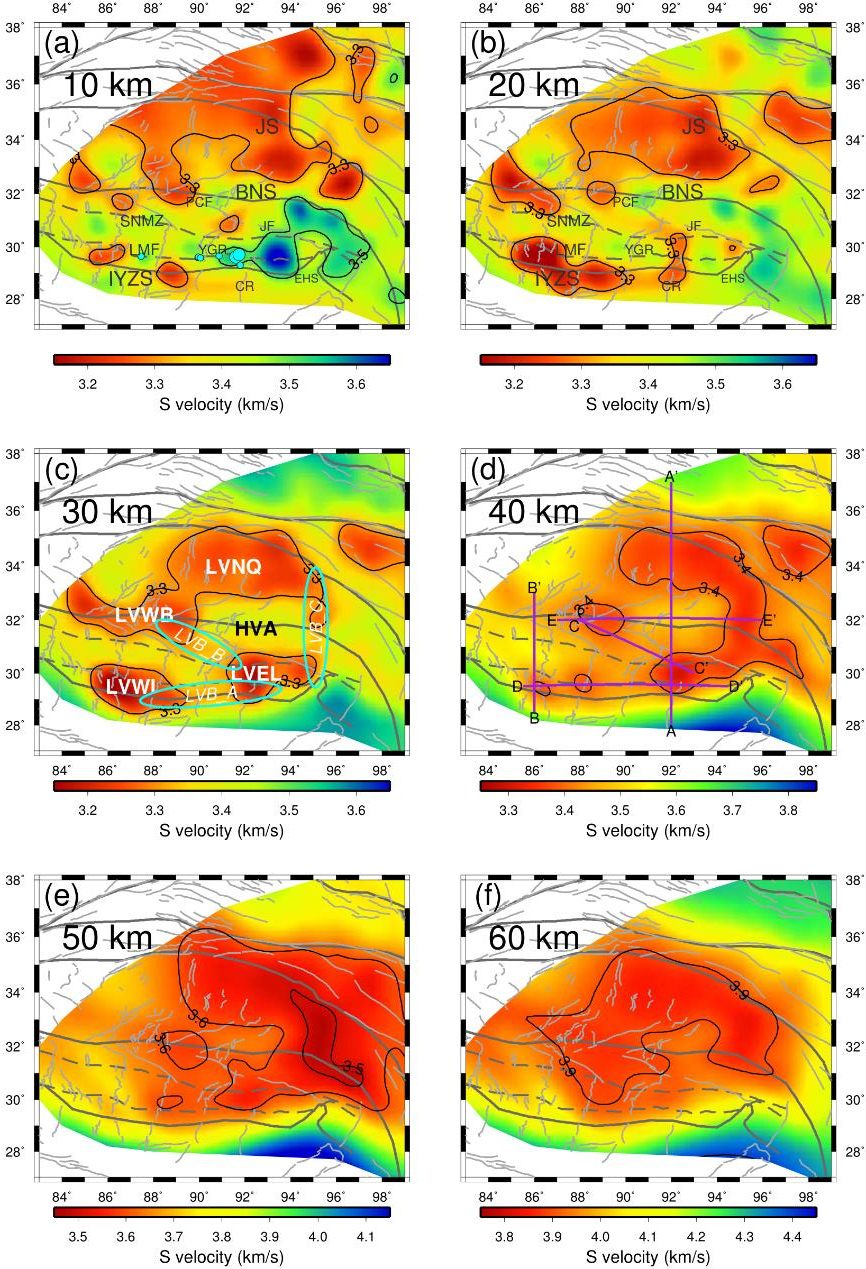 图1. 青藏高原地壳横波速度模型在不同深度的水平切面。速度等值线以黑线标注,构造边界,断层等以灰线表示。(a)中青色圆代表中新世斑岩型铜矿位置。(c)中英文缩写代表壳内低速异常体(LVEL,LVWL,LVWB,LVNQ)和高速异常体(HVA),青色椭圆代表低速异常条带。