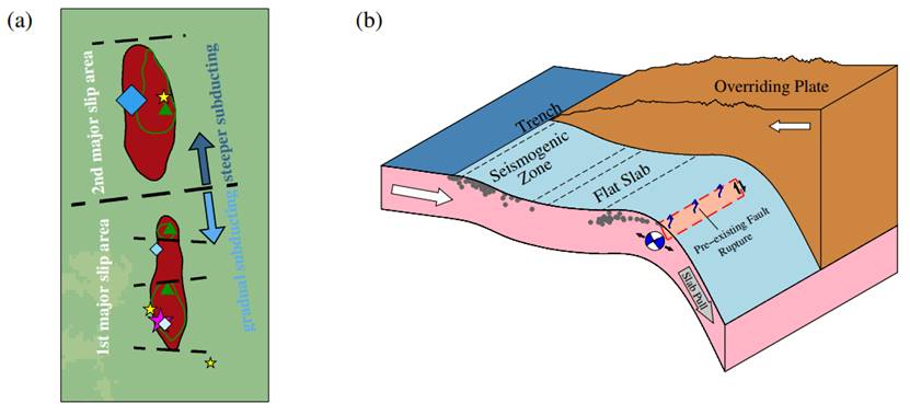 研究结果显示,三个断层高滑移率区域和三个高频能量辐射子事件存在一一对应关系,说明了地震破裂过程中高频能量的辐射与断层滑移的变化有关。本研究还发现,两个滑移区域的特征不同,远离震源的滑移区域的破裂面积、滑移量、破裂速度、能量辐射等都要大于靠近震源的滑移区域。沿着破裂传播的北北西方向,我们发现在两个滑移区域之间,板片俯冲的角度可能发生了变化(图1)。因此,可能是俯冲板片形态的变化造成了特征不同的破裂,说明了俯冲板片的形态可能决定了地震破裂的发展过程(图2a)。此外,本研究认为是由于板片重新弯曲产生的力的作用激活了板片内原先存在的正断层(这些正断层是板片在海沟处发生弯曲并开始俯冲时产生的),同时可能伴随脱水脆化的作用(水在海沟处进入这些正断层內),最终产生了本次地震(图2b)。