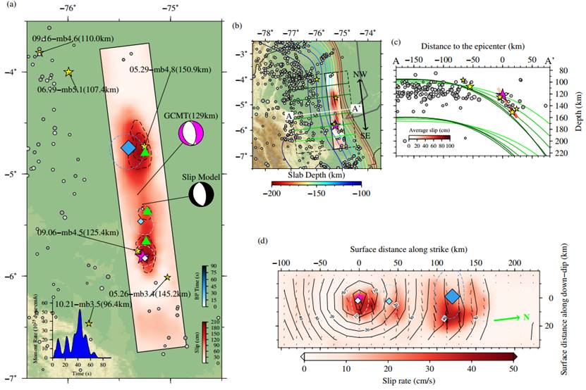 图1. (a)2019年5月26日秘鲁北部8级地震的滑移分布(红色平面)、滑移率分布(黑色虚线等值线,绿色三角形为高滑移率位置)、高频能量辐射分布(蓝色菱形,颜色随破裂时间变化)、余震分布(黄色五角星);(b)和(c)为垂直断层走向作剖面,显示俯冲板片的形态变化(板片模型来自slab2.0模型);(d)为滑移率与高频能量辐射(蓝色菱形)在地表的投影,绿色箭头指示北方向。