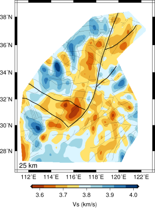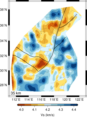 图2 研究区域5 km、15 km、25 km和35 km深度横波速度切片