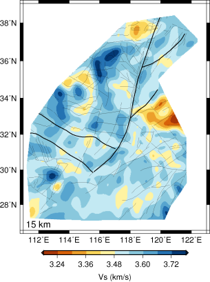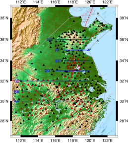 郯庐断裂带是中国东部最重要的断裂带,自中生代形成以来,郯庐断裂带在整个中国东部地质构造和演化中都扮演着重要角色。有关郯庐断裂带的地震活动性、起源及构造演化以及对其周边拉张盆地和矿集区的控制作用等问题还存在诸多争论。因此建立郯庐断裂带及其周边地区地壳三维精细结构具有重要的研究意义。本研究中我们收集了郯庐断裂带周边的253个国家固定台以及111个流动地震台的地震数据(图1),包括中科大在郯庐断裂带安徽合肥至江苏宿迁段布设的30个宽频带地震台站,其中国家地震台地震数据记录时间从2011年到2014年,流动台的记录时间从2014年至2015年。我们首先采用噪声互相关处理技术提取台站间经验格林函数,再利用图像处理技术从台站间经验格林函数中提取到周期为5-50 s的瑞利面波相速度频散数据,最后基于直接反演方法直接反演混合路径的瑞利面波相速度频散数据得到郯庐断裂带中南段地壳三维精细横波速度结构。从横波速度切片中可以看出(图2),沿郯庐断裂带附近的上地壳结构(5 km)存在明显的分段性。从九江至庐江段东西部速度异常存在明显差异,东部呈现低速异常,西部大别造山带呈现高速异常;从合肥至嘉山段东西部异常也存在差异,东部张八岭隆起呈现高速异常,西部合肥盆地为低速异常;从嘉山至潍坊段东部苏鲁造山带、胶莱盆地、胶莱隆起和西部的鲁西隆起都是呈现高速异常。郯庐断裂带沿线中地壳(15 km)整体呈现弱高速异常,而在下地壳(25 km)转为弱低速异常。郯庐断裂带下地壳至上地幔顶部(35 km)东西部存在明显差异。其中东部沿长江中下游成矿带区域呈现高速异常,东部的苏鲁造山带、胶莱盆地和胶莱隆起呈现低速异常,西部的大别造山带和鲁西隆起为低速异常。从剖面中(图1)可以观测到一个明显的特征是,郯庐断裂带中下地壳存在明显的高速异常体隆起,以BB’、CC’和FF’中最为典型。