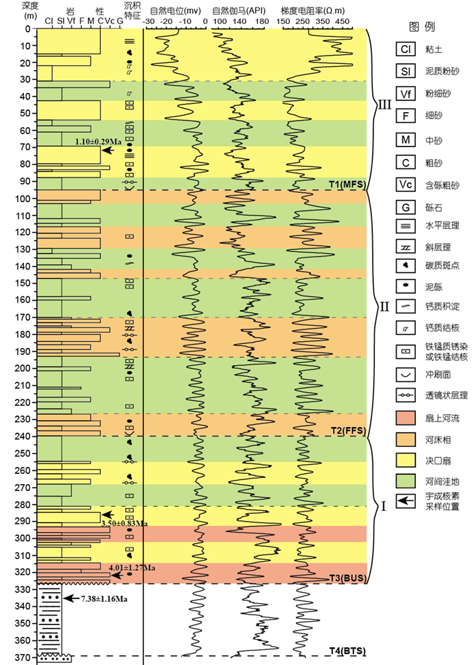 板泉盆地地层结构及沉积旋回对盆地经历的幕式拉分伸展有着明显的响应。强烈拉分发生前,受局部裂陷作用,盆地内缓慢堆积了一套薄层中新世泥岩。拉分伸展早期和晚期阶段盆地内先后充填了粗颗粒冲积扇相(沉积体系Ⅰ)和相变频繁的辫状河-曲流河相(沉积体系Ⅱ)地层,后拉分阶段沉降期盆地内充填了一套泛滥平原相地层(沉积体系Ⅲ)。