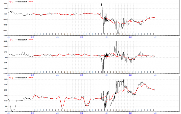1月20日地磁暴时,两台仪器精准记下了磁场的“跳变”:水平分量几小时内大幅下降,磁偏角明显波动,这些数据就是地磁暴的“脚印”。