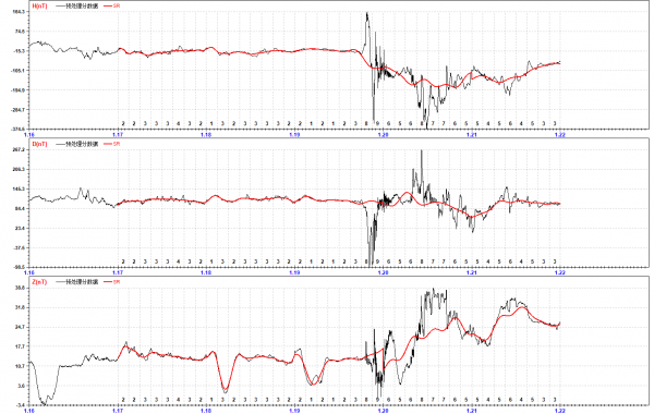 1月20日的地磁暴中,蒙城站两台GM5仪器的记录高度一致:磁场水平分量短时间内下降数百nT(磁场单位,大家不用记,知道是“变化很大”就行),磁偏角波动显著,后续用了几天才恢复正常。这些数据,成了这场特大空间天气事件的“中国观测样本”。