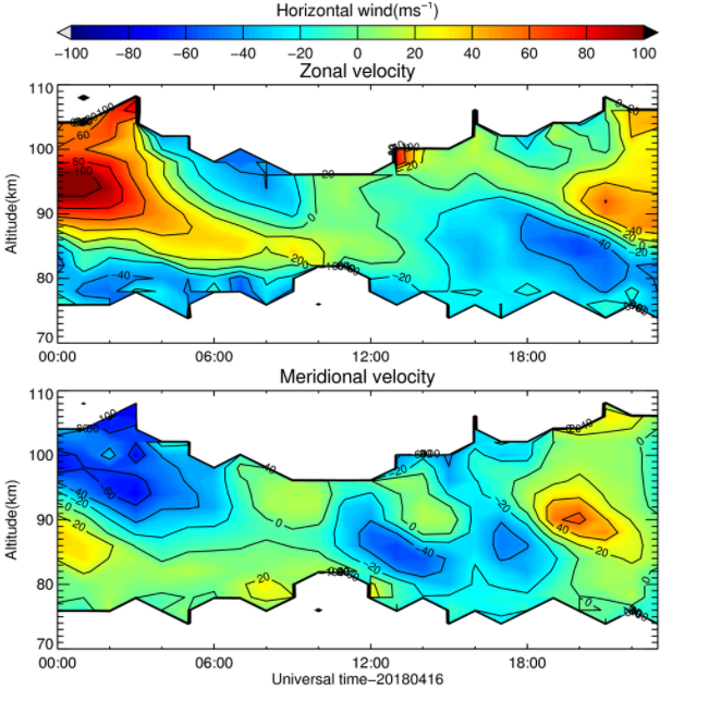 图3 蒙城流星雷达观测2018年4月16日的中间层-低热层大气纬向和经向风场